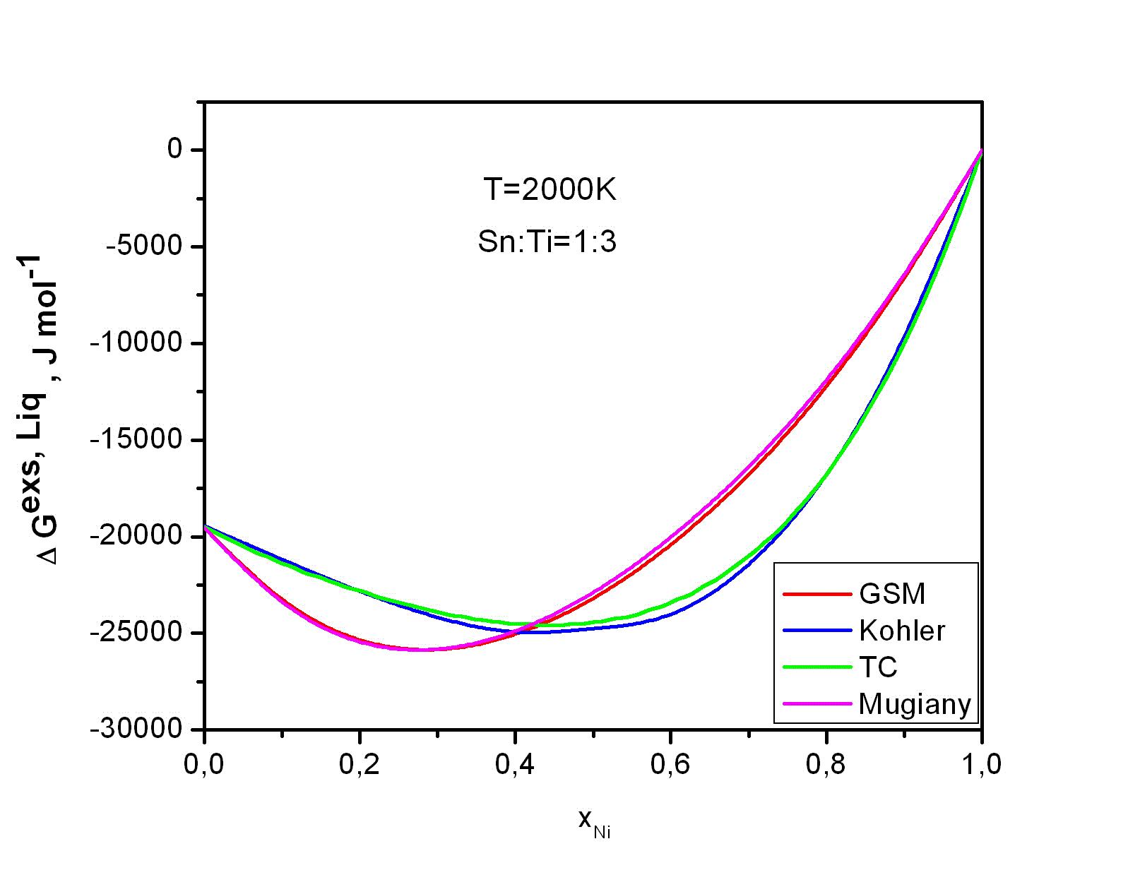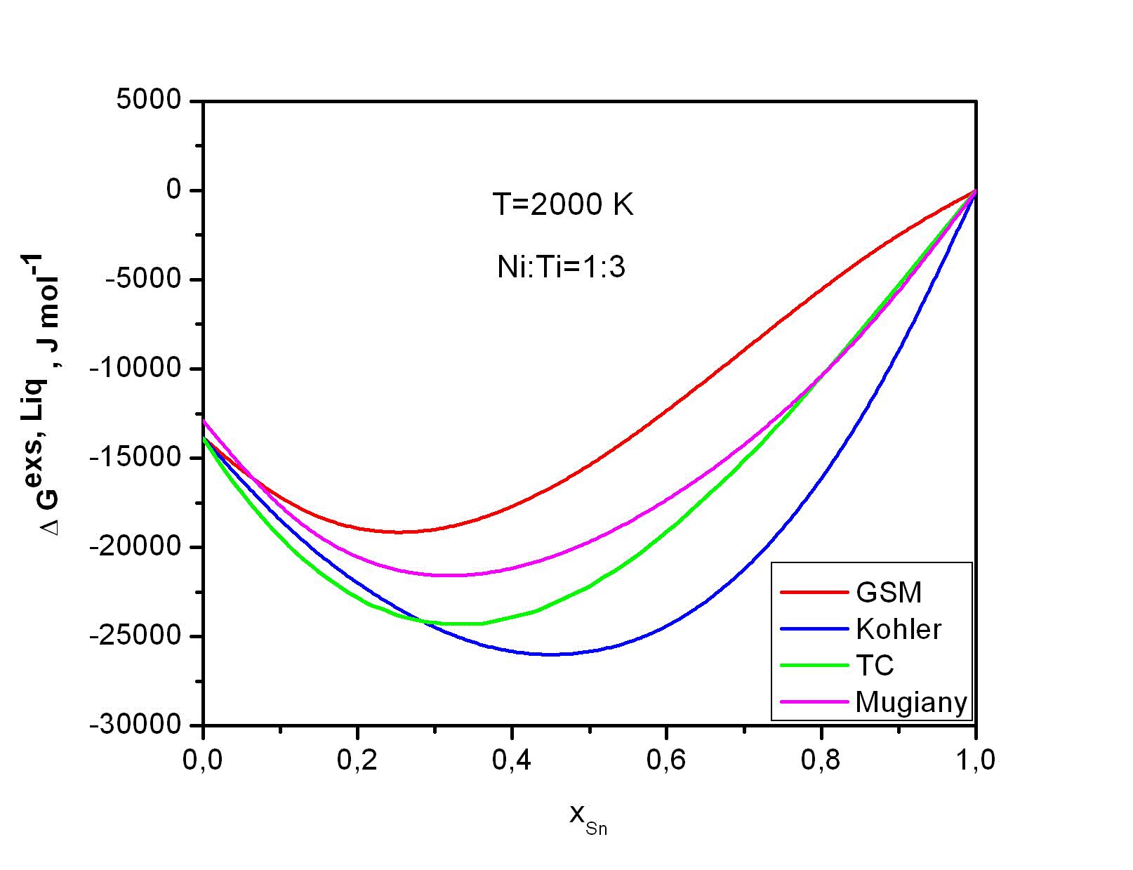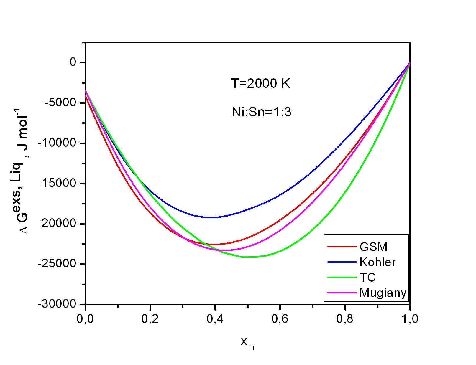 Ternary interaction parameters (L0, L1 and L2) of the liquid phase were determined using General solution (geometric) model from thermodynamic data of the binary end–systems (Ni–Sn, Ni–Ti, Sn–Ti). Ternary parameters exhibit values: L0 = - 70360.5 - 0.263*T; L1 = -113023 - 11.574*T; L2 = - 131755 - 17.101*T. Negative molar excess Gibbs energies were obtained by all models.