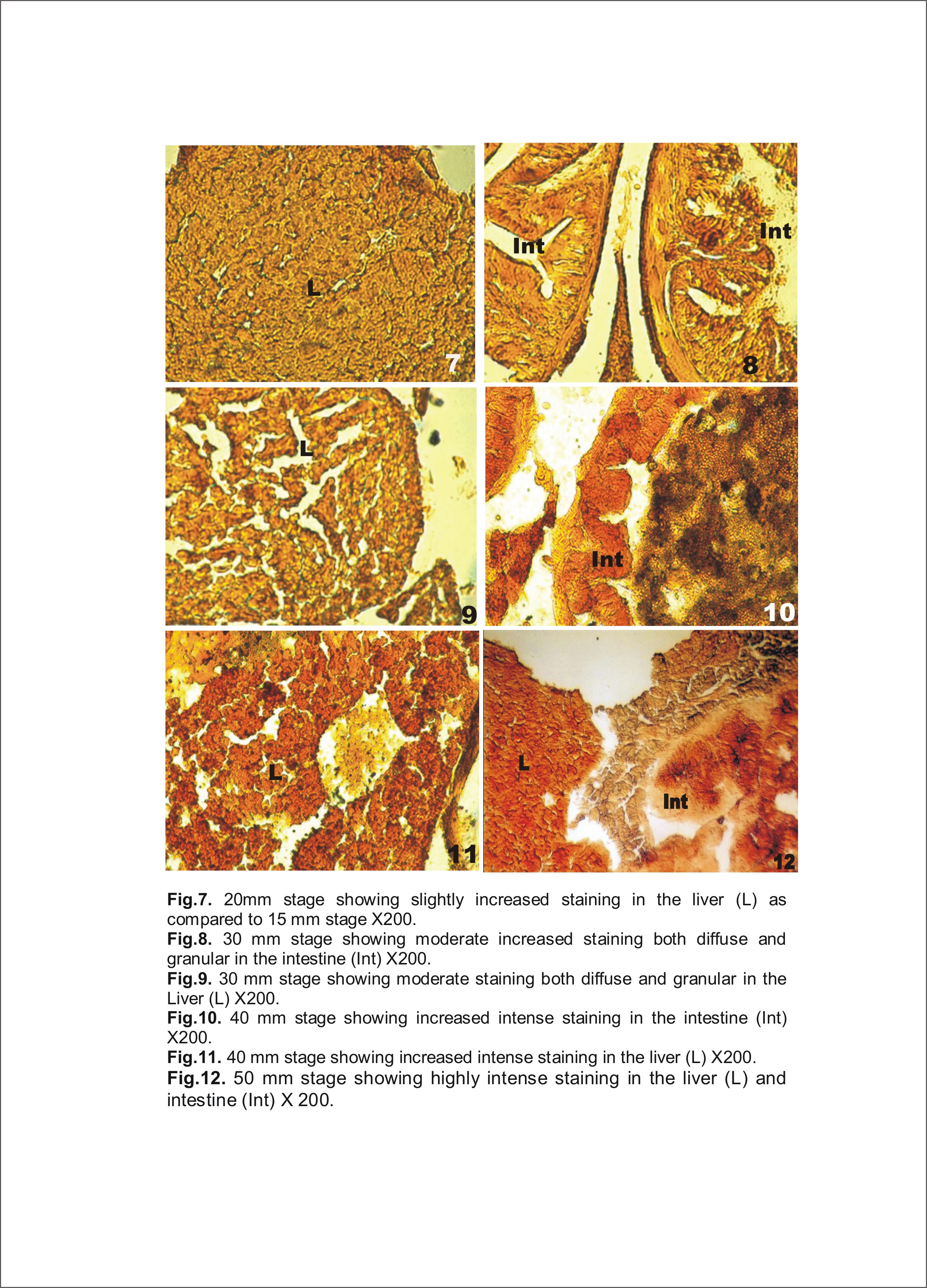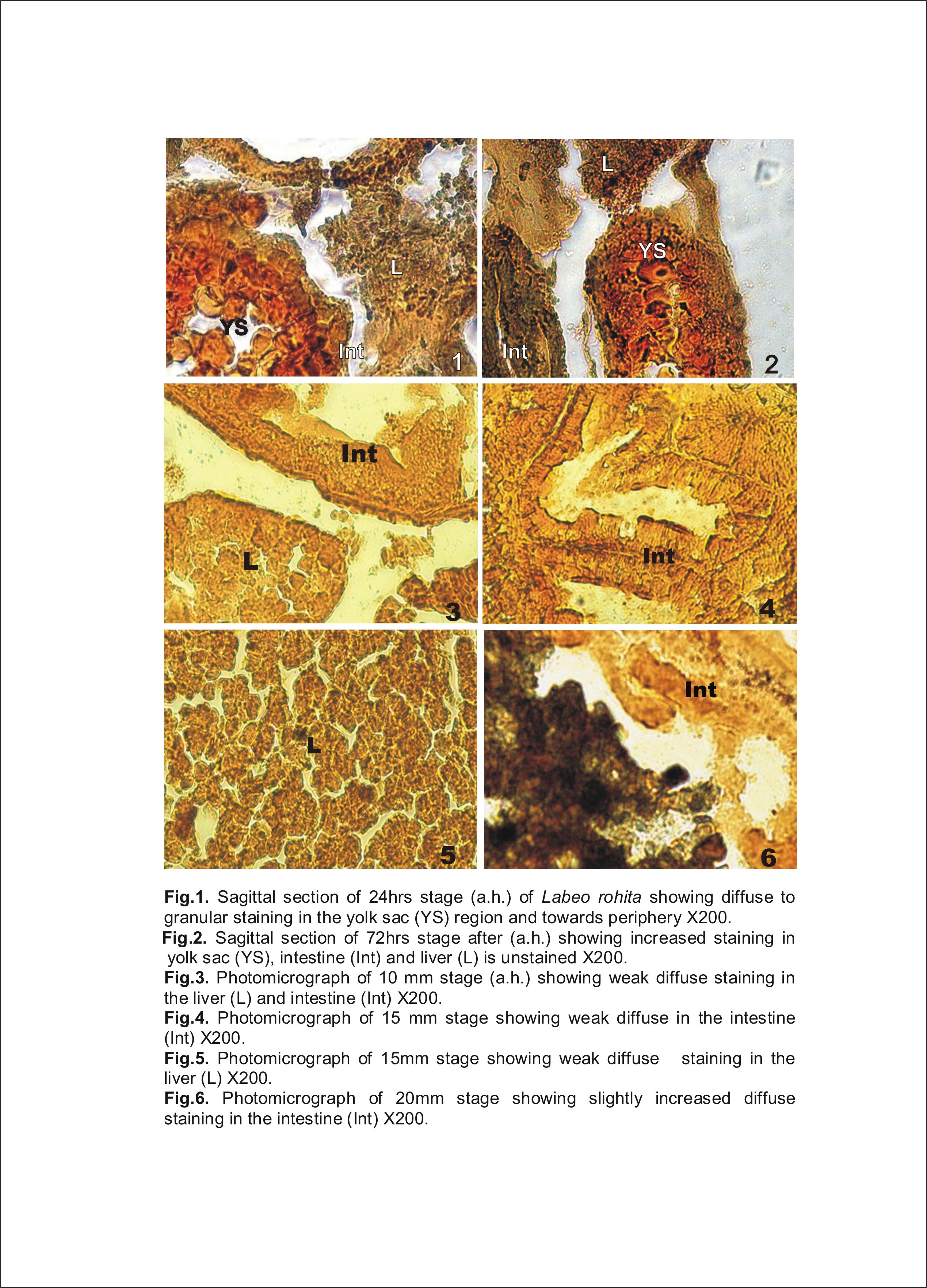 β-Glucuronidase is a lysosomal enzyme, it is largely studied studied in mammalian species. In the present study the attempt was made to localize this enzyme in the liver and intestine during the development of teleost, Labeo rohita. For the demonstration of enzyme activity, Naphthol AS-BI-β-Glucuronide was used as a substrate along with diazotized pararosaniline. β-Glucuronidase shows variation in both the liver and intestine during the development of L. rohita.  The enzyme activities in both the organs were increased gradually from 10 to 50 mm stage of development. In the sac-fry (5-7.5mm), the enzyme activity was confined in yolk sac and no enzyme activity was observed in the liver and intestine. It was concluded that the presence of β-glucuronidase in the yolk sac might be due to its role in the yolk metabolism.  Gradual increase in enzyme activity from 10mm onwards in the intestine could be due to maturation of digestive tract and in the liver due to increase in the metabolic load with increase in growth and age. Â